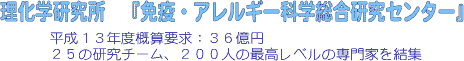 解読がほぼ完了した人間の全遺伝情報(ヒトゲノム)のデータをもとに、理研・横浜研究所にできる遺伝子多型研究センターなどと協力し、免疫機構の全容を分子レベルで解明する事を目的にします。