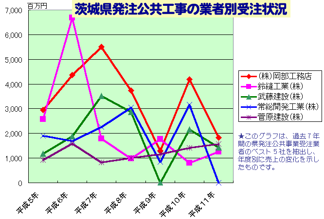| 茨城県では、公共工事の入札・契約手続きの透明性、客観性を高めるために、平成5年度より1億円以上の工事について、受注した企業上位20社を公開しています。 このページでは、直近7カ年(平成5年度〜11年度)の資料から県内業者を抽出して年度別に集計したものを、県議会議員の井手よしひろの責任において公開します。 なお、公開資料は茨城県土木部監理課建設業担当より公表されたものであり、JVについては、その出資比率によって受注額を按分して計算しております。(表中の数値の単位は、百万円) |