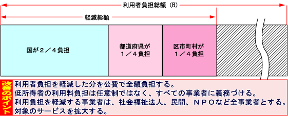 そこで、国は平成14年度末(平成15年3月31日)までの特別対策として、地方自治体や社会福祉法人が、低所得者に対して利用料の一部を軽減できることとし、減免を行った場合、法人が負担した費用の一部を国と県、市町村が負担する制度を設けました。