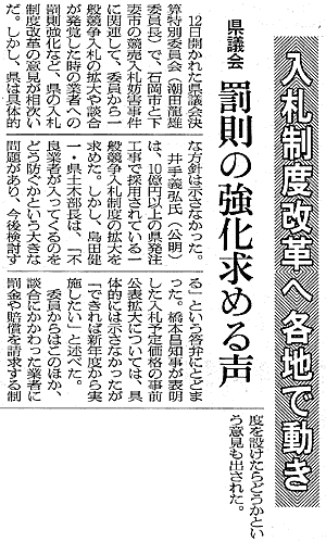 12日(2002/2/12)開かれた県議会決算特別委員会(潮田龍雄委員長)で、石岡市と下妻市の競売入札妨害事件に関連して、委員から一般競争入札の拡大や談合が発覚した時の業者への罰則強化など、県の入札制度改革の意見が相次いだ。しかし、県は具体的な方針は示さなかった。