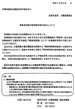 つまり、障害者手帳などを持っていなくても、市町村長が認定すれば障害者控除を受けられることになります。新潟県の長岡市と上越市、小国町では、2002年2月、介護保険の要介護度1と2の人に関しては「障害者」として、要介護度3〜5の人は「特別障害者」として認定する「障害者控除対象認定書」を発行して、要介護認定者に郵送しました。