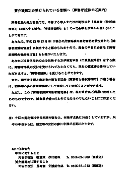 新潟と愛知県内の一部市町村では、要介護1〜5の認定を受けている人等(障害者手帳等の交付を受けている人は除く)について、「障害者控除」を受けるための「障害者控除対象者認定書」を郵送で交付しました。
