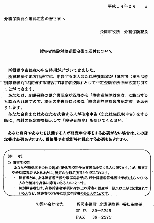 障害者控除対象者認定書の送付について 所得税や市民税の申告時期が近づいてきました。