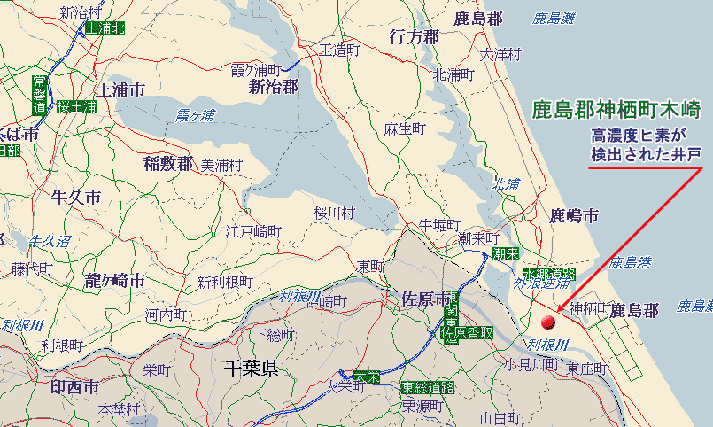 ![]() 高濃度のヒ素が検出された神栖町木崎付近の地図 |