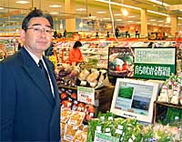 また、県内のスーパー2店舗(下記に詳細紹介あり)では、データベースの端末を設置し、直接消費者が生産履歴情報を入手することができます。(写真はカスミ水戸見川店の店頭を視察する井手よしひろ県議、2003/12/1)