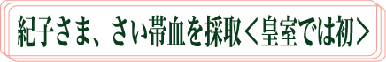 2006年9月6日、秋篠宮妃紀子さまが男児を出産されました。紀子さまは、白血病治療に有効なさい帯血を採取され、公的さい帯血バンクに提供されました。さい帯血を提供された事例は、皇室関係者では初めてです。日本中が天皇家の男子出産をお祝いする中で、臍帯血移植の普及に大きなインパクトになると思います。