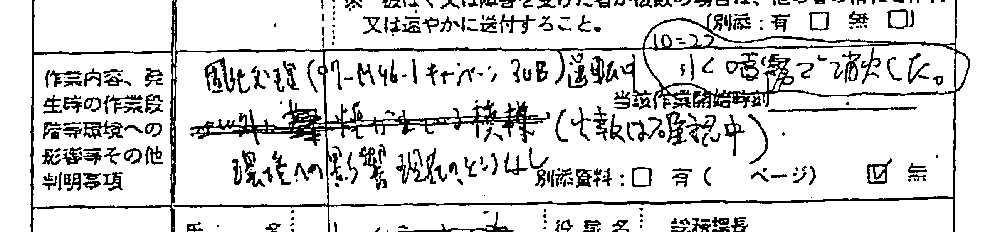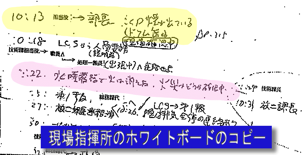 その直後(10:24)現場指揮所に到着した同部技術課長(以下「技術課長」という。)は、ホワイトボードの記載を見て、これを事実と考え、担当役の書いたFAX連絡文書第1報に「10:22水噴霧で消火した」と加筆し、事業所連絡責任者の総務課長に送付し、総務課長は外部関係者に送付した。その後、多数の報告が次々と現場指揮所に殺到し始めたため、この10:22という時刻の意味することは正確に再確認されることなく経過した。