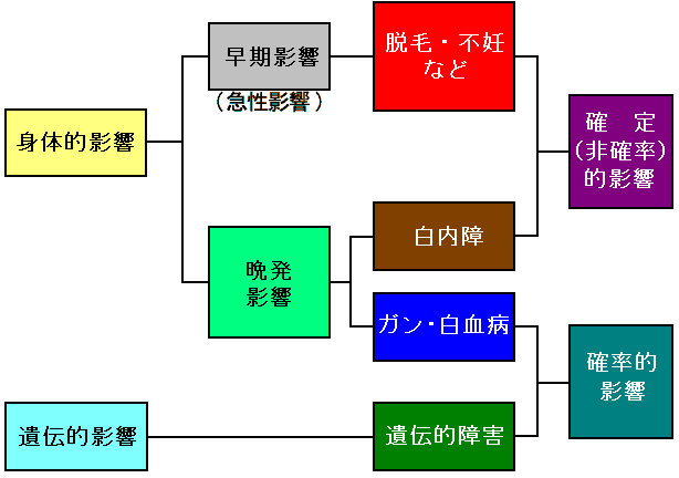 放射線の人体への影響 放射線の人体への影響には、放射線を受けた本人に現れる身体的影響と、子孫に現れる遺伝的影響(注) があります。 (注)これまでに人間で放射線による遺伝的影響か発生したという事実は確認されていません。 身体的影響は、放射線を受けて比較的短期間の内に現れる脱毛などの急性の影響(確定的影響)と、長い期間を経て現れるがんや白血病などの晩発影響(確率的影響)とに分けられます。