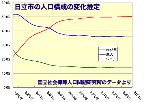 日立市では、概ね今後20年で人口構成もシニア世代と成人世代が逆転化するなど日立市でも高齢化が進んでいます。(国立社会保障人口問題研究所のデータをもとに分析したグラフ→)