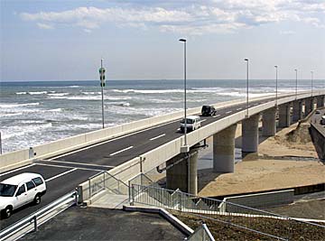 国道6号日立バイパスの工事は、昭和61年度から用地買収、平成3年度からは陸上部の工事が着手されました。平成8年6月には、漁業者との補償も解決し、海上部の工事が始まりました。計画は大幅に遅れていますが、平成13年春には、本宮アクセスまでの部分供用が開始され、平成15年5月から、鶴首ループ橋までが供用されています。