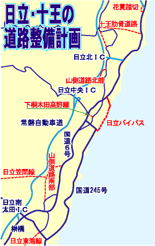 国道245号は、市の中心部で国道6号に結ばれているため、実質的に市内の南北交通を処理する幹線道路としては、国道6号のみです。日立市の幹線道路の交通量は、国道6号が約36,000台/日(平成11年10月、国土交通省が・西成沢町で調査)、国道245号で約27,000台/日(平成2年度交通センサス)と、道路の交通容量を大きく越えています。関東全体の一般国道の平均の約3倍に達しています。市内の通勤時の平均時速20キロは、関東地方の平均より10キロも遅く、単純計算すれば、市内の10キロ圏のマイカー通勤者は、ノロノロ運転で週100分の無駄が生じていることになります。