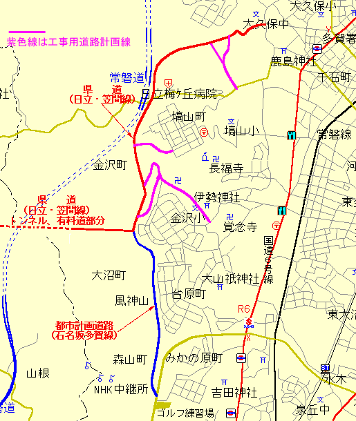 この道路は、既存の山側道路(石名坂坂上〜森山町)の中間部分から分岐し、台原団地、金沢団地の山側を通り、県道日立・笠間線(図の赤字線の部分)に接続する道路です。