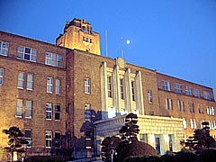 県庁三の丸庁舎の夜景 ライトアップされた煉瓦造りに庁舎のかなたに月が輝いていました。 |