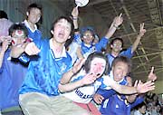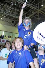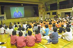 FW鈴木隆行の母校、日立市立大沼小の体育館では、鈴木がかつて在籍した大沼少年サッカースポーツ少年団の児童約60人や恩師など約300人が5メートル四方の大スクリーンに声援を送りました。ボールがわたった鈴木が大写しになる度、オレンジのユニホーム姿の児童はうちわを振り回して声援を送っていました。