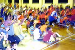 日立市民運動公園中央体育館に1500名のサポーターを集めて300インチの大画面による実況放送を行いました。