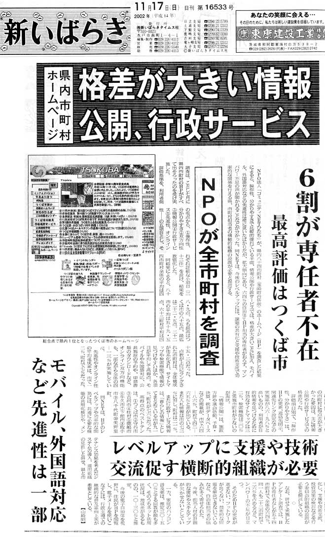 日立市多賀町のNPO「コミュニティNETひたち」が、県内84市町村(つくば市と茎崎町の合併前)のホームページを調査し、その結果を公表しました。
