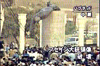 バクダット市内のフセイン像が、アメリカ軍とイラク市民のよって引き倒される。(テレビニュースの画面をキャプチャー) |