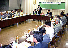 石井県代表の挨拶の後、質疑応答、意見交換を行いました。参加者よりは、市町村合併と三位一体改革の方向性、笠間市のまちづくりの方向性、少子化対策、特に小児医療の充実についてなどの質問、要望などが寄せられました。
