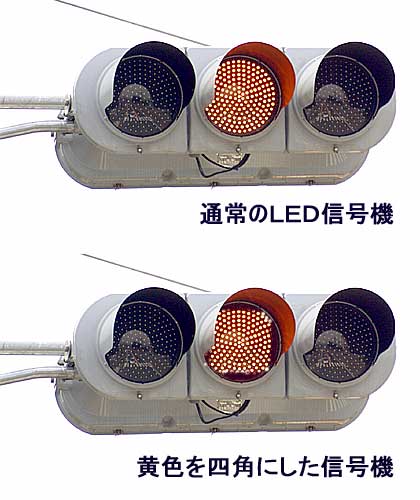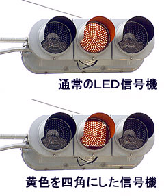 そこで、井手よしひろの提案です。LED信号は小さなLEDを数百個並べて作っているわけですから、何も丸い必然性はないわけです。いっそ、黄色い信号灯を●ではなく■に変えてしまったらどうでしょう。色でなはく、形を認識して注意信号を識別する、この提案を皆さんはいかが考えますか?