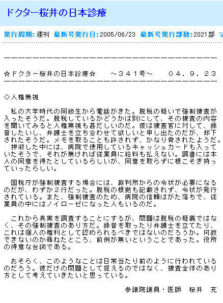 参考:桜井充参議院議員のメルマガ「◇人権無視」(2004/9/23付け)*万一削除された場合はこちらのキャプチャー画像をご参照下さい