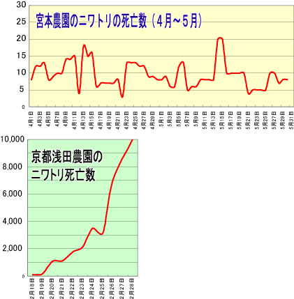 昨年2月に京都で発生した鳥インフルエンザは、強毒性であり、当初1日100羽程度の死亡数が、10日余りで1万羽に達するという劇的な広がりを見せました。ところが、今回の事例では、1ヶ月平均の死亡数を見てみると、通常1日6~7羽であった死亡数が4月に10羽を超えた程度で、死亡数によって鳥インフルエンザを疑うことは出来なかったようです。