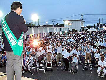 (写真上:麻生町内で開催されたぬかが福志郎候補の出陣式、午後6時半頃撮影)