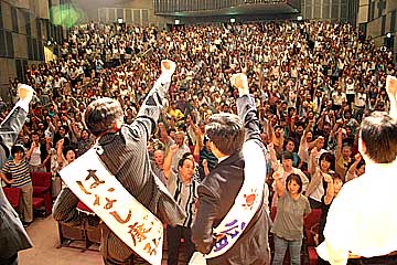 (写真上は、比例区公明党を訴える石井啓一候補:写真下は、必勝を誓っての勝ち鬨)