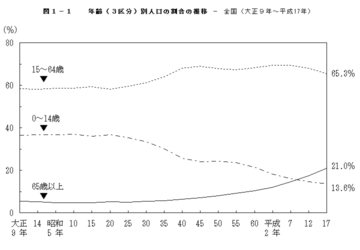 平成17年の人口(1億2776万人)を年齢3区分別にみると、15歳未満人口は1740万人(総人口の13.6%)、15~64歳人口は8337万人(65.3%)、65歳以上人口は2682万人(21.0%)となっています。