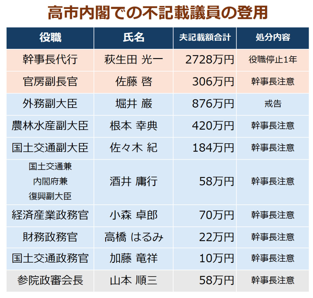 高市首相は、政治資金収支報告書に不記載があった議員(いわゆる裏金議員)を、閣僚には登用されなかったものの、副大臣・政務官として7人起用しています。