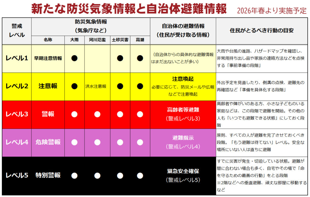 これまでの警報や注意報は、専門的で複雑な印象があり、「結局いつ避難すればいいの?」という声をよく耳にしました。そうした課題に応える形で、2026年の梅雨時期から、災害ごとに5段階のレベルで情報が整理され、新たに「危険警報」が加わることになりました。