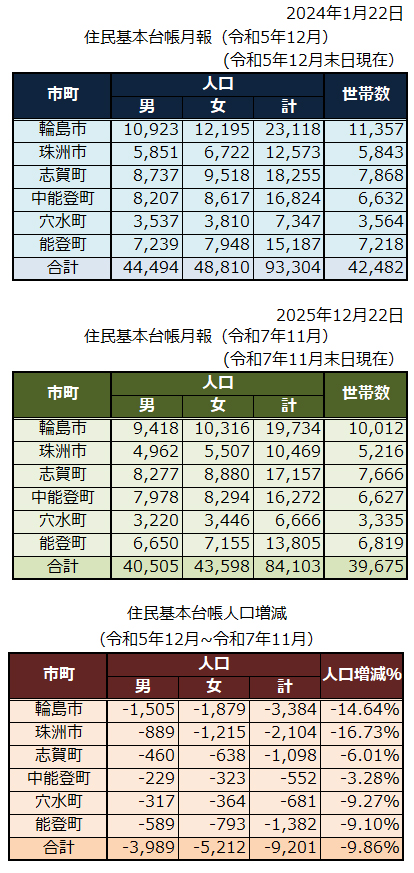 石川県の資料によると、対象となる6市町(輪島市、珠洲市、志賀町、中能登町、穴水町、能登町)の総人口は、93,304人(平成5年12月)から84,103人(平成7年11月)へと9,201人減少しました。これは約9.9%の人口減にあたり、わずか2年足らずで1割近い人口が失われたことになります。