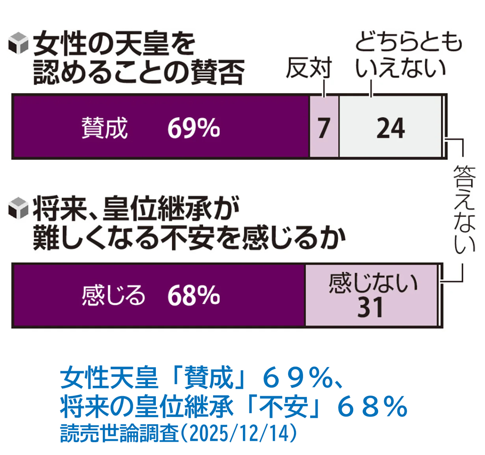 それにもかかわらず、自民党が提示した解決策は、あえて「旧宮家の男系男子を養子に迎える」という、今の私たちには馴染みの薄い、極めてテクニカルな手法を優先するものです 。今の日本列島を「強く豊かに」と願う一方で、皇室という国の象徴については、国民の7割から9割が抱いている「女性天皇でも良いのではないか」という素朴で切実な願いを、伝統という言葉で封じ込めてしまっているようにも見えてしまいます。