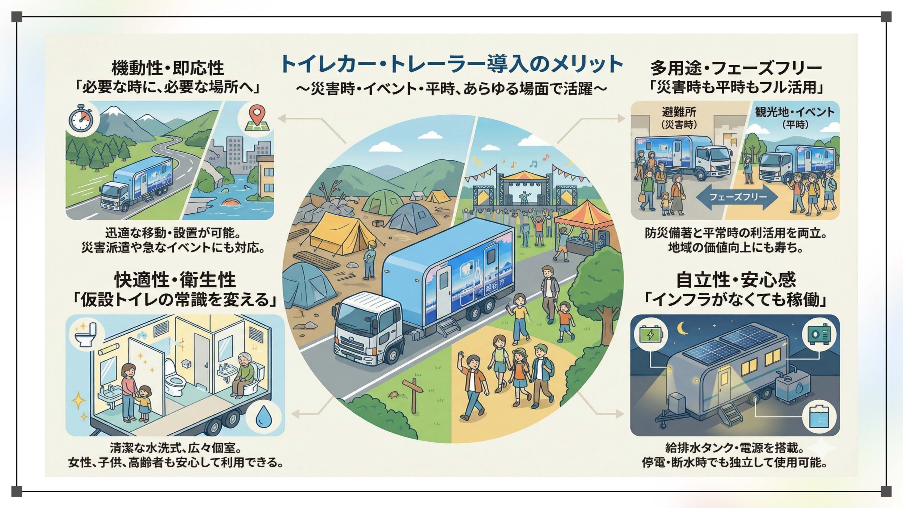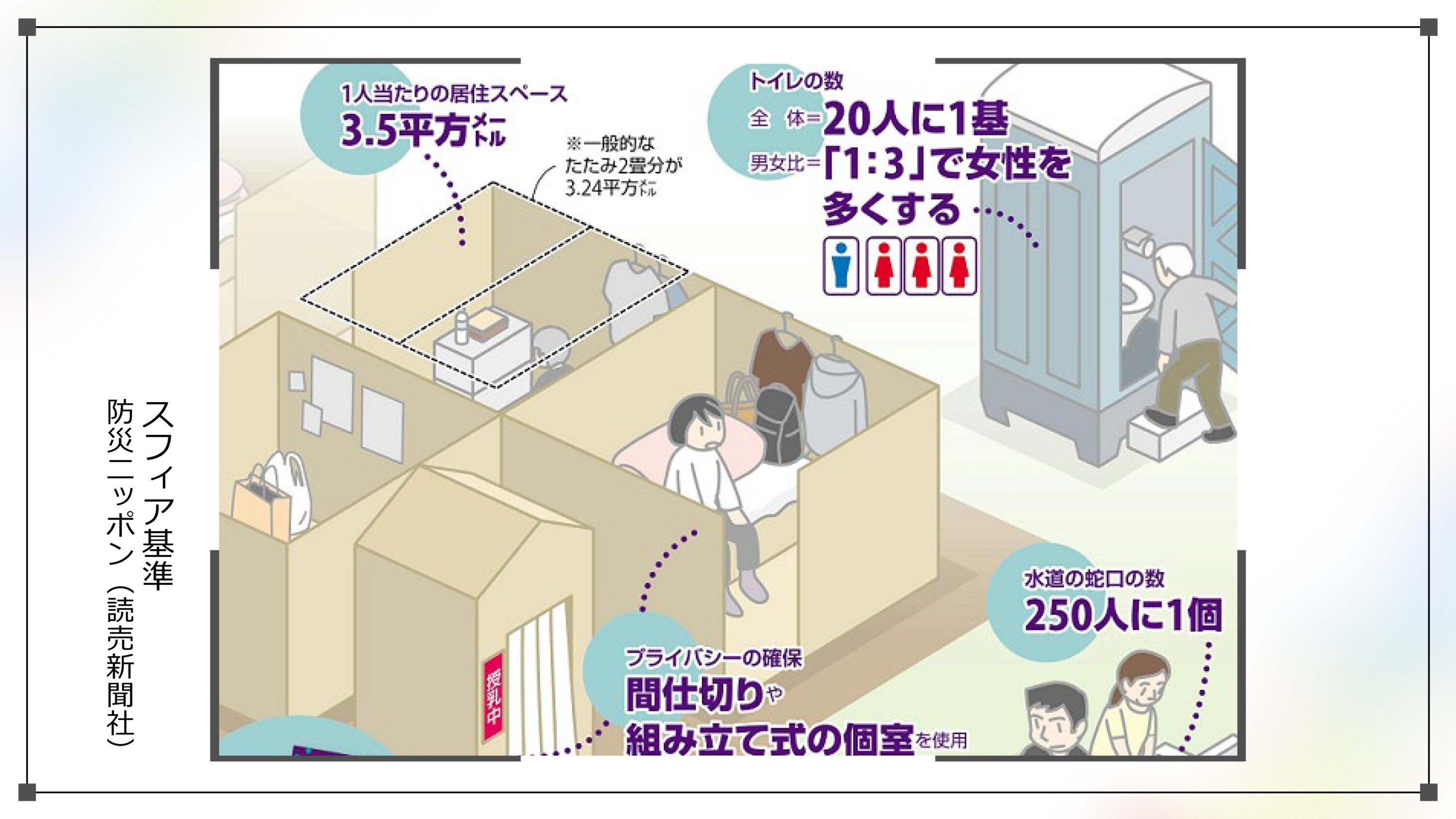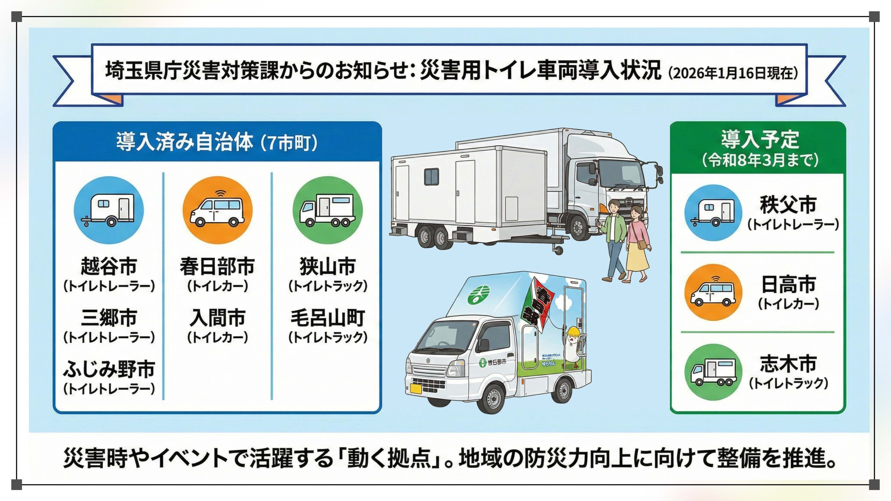 また、避難所の環境整備についても重要なテーマとして共有しました。避難所は、単に雨風をしのぐ場所ではなく、被災された方々の健康と尊厳を守る生活の場でなければなりません。その基本となるのが、「TKB」、すなわちトイレ・キッチン・ベッドの充実です。国際的なスフィア基準では、居住空間の確保や、女性の負担を軽減するためのトイレ配置など、具体的な目安が示されています。近年では、平時はイベントなどで活用し、災害時にはすぐに現場に駆けつける「トイレカー」や「トイレトレーラー」など、フェーズフリーの設備も注目されています。こうした取り組みは、新座市の安心感をさらに高める大きな力になるはずです。