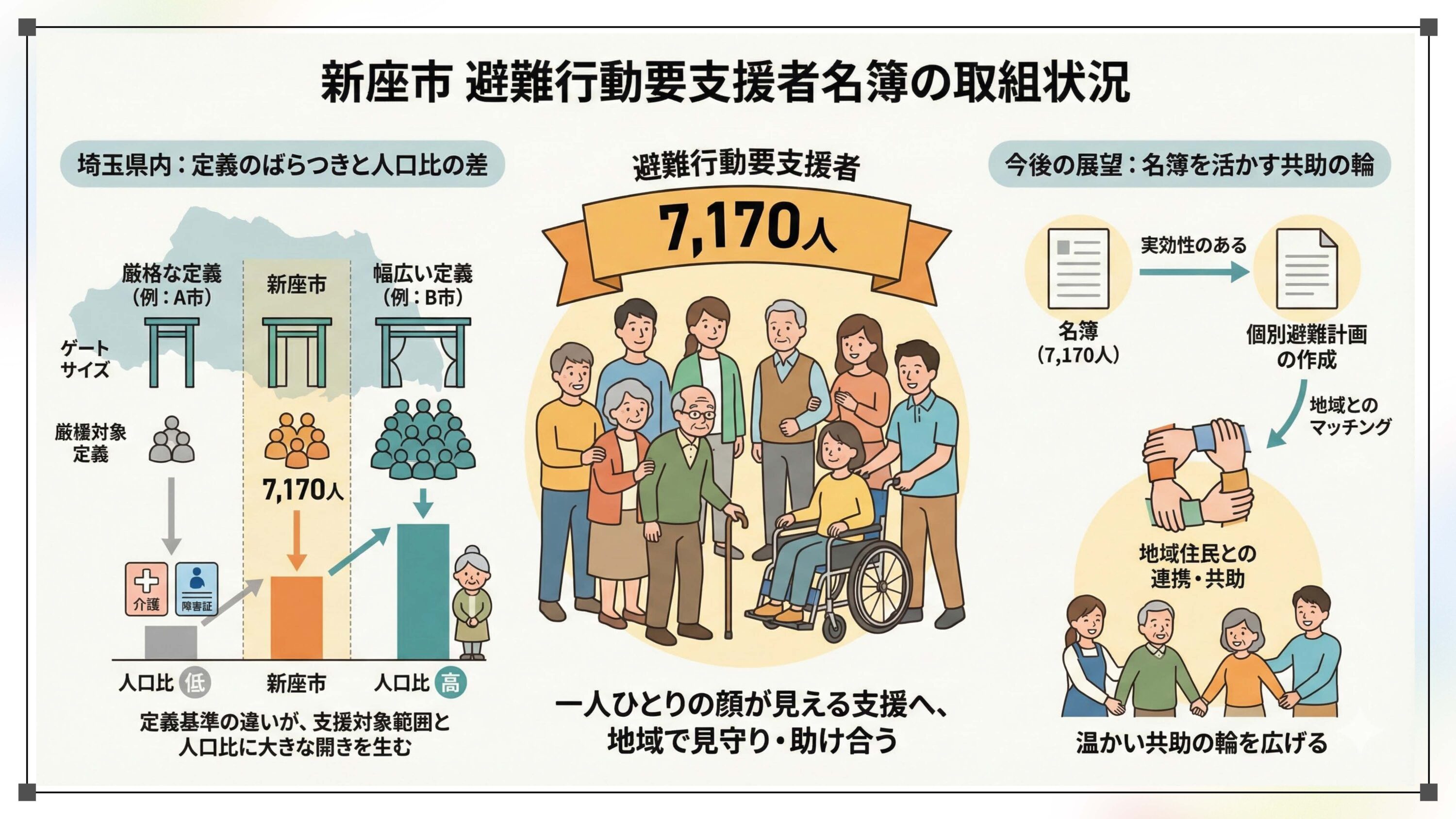 新座市においても、避難行動に支援を必要とする方は7,000人を超えています。名簿を整備するだけでは十分とは言えません。地域の中で、「誰が、誰を、どのように支えるのか」を日頃から話し合い、顔の見える関係を築いておくことこそが、いざという時に命を守る力になります。共助の輪を平時から育てていくことが、最大の防災対策であると、改めて実感しました。