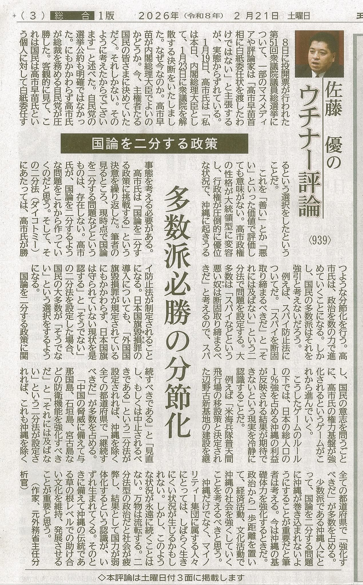 作家であり元外務省主任分析官の佐藤優氏は、琉球新報の評論「ウチナー評論」No.939の中で、この点を鋭く指摘しています。佐藤氏は、現時点で日本社会に「国論を二分する問題」が自然発生的に存在しているわけではなく、むしろ政治の側が「これから二分する構図をつくっていく」のではないかと論じます。そして、その二分法は、政権が勝てるように設計された「分節化」であるといいます。