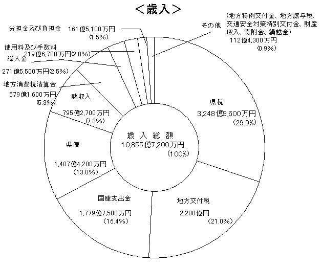 | 茨城県の2001年度(平成13年度)一般会計当初予算は、総額1兆855億円で、前年度当初に比べ0.9%増となりました。財政難の中、3年ぶりに増加となりました。 しかし、財政再建を最優先に投資的経費などを抑制する一方で、公債費や扶助費など義務的経費が増加した結果の予算編成で、緊縮型予算となっています。 新規の大規模事業は抑制され、新規事業では生活者の視点に立ったソフト事業が主な内容となっています。 歳入を見てみると、一般財源は6630億円で前年度当初比3.4%増。このうち、県税は3250億円(前年度当初比4.6%増)、地方交付税2280億円(4.6%減)、一般財源基金繰入金180億円(26.1%減)、となっています。 景気回復がある程度見込めるとの判断から、法人事業税など法人2税は前年度当初比22.1%増の900億円を計上しました。一般財源基金199億円は、ほぼ全額を取り崩す計画です。 歳出は、投資的経費と一般行政費はそれぞれ2580億円(同0.7%減)、1980億円(4%減)と事業見直しで削減しました。県債の償還に充てる公債費90億円、介護保険制度の導入などに伴う扶助費50億に、人件費などを加えた義務的経費は前年度当初比で3.3%増となり、6300億円に上っています。 以下、2001年度県予算の概要を、県のホームページに内容を転載して、ご紹介いたします。 |