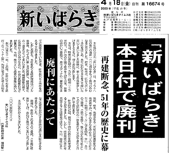 廃刊に当たって 本社発行の日刊「新いばらき」は、きょう18日の発行の通算16674号をもって廃刊のやむなきに至りました。読者、販売店、広告スポンサー各位をはじめ、長年にわたり本社をご支援いただいてまいりました皆様に、衷心より感謝申し上げますとともに、深くおわび致します。