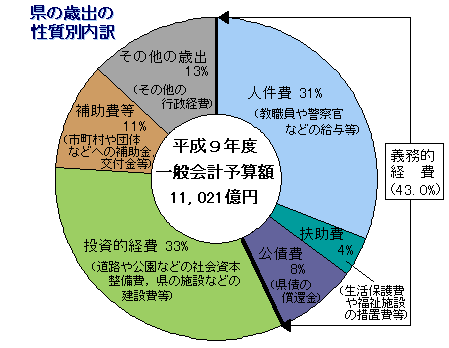 このような中,今後の県の財政収支を試算しますと,公共投資を平成9年度予算と同水準に据え置いても,歳出の40%以上を占める人件費や県債の償還金など縮減することが難しい義務的経費の増加などにより,毎年度約1千億円もの財源不足(赤字)が生じます。平成10年度の不足額でさえも,基金(約540億円)では,到底補てんできない状況に至っています。また,県債の残高も増え続け,まさに県の財政は,大きな危機に直面しています。