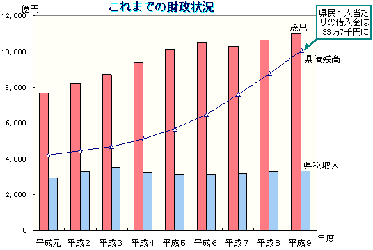 県の財政は、平成9年度末には借入金である県債の残高が一兆円を超え、一方、預貯金に相当する基金は約540億円まで減少する見込みです。