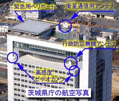 防災ヘリコプターは平成7年に導入され、翌年にはヘリビデオシステムも搭載されました。県警のヘリコプターにも同システムが導入され、機動力ある情報収集システムとなっています。更に、県庁24階には高性能ビデオカメラが設置され(東西南北の4カ所に設置)、水戸市内を広くカバーすることが出来るようになりました。
