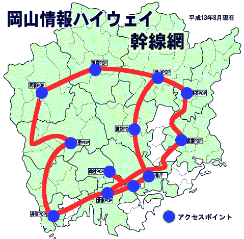 岡山県庁を訪ね、企画振興部IT推進室情報政策課石原伸一主幹から、岡山県のIT戦略の概要をお聞きしました。岡山県は、他県に先駆けて平成8年から『岡山情報ハイウェー構想』を立ち上げ、自前で光ファイバー網の構築を進めてきました。接続方式は、ATM方式。24芯、26芯の光ファイバーを使用し、総延長が基幹線で450kmあります。アクセスポイント(POP)が、倉敷市や津山町など10カ所に設置されています。 NOCと岡山市(県庁)、倉敷市、県北の津山局を結ぶ幹線は、622Mbpsで結ばれ、他の幹線は155Mbpsで接続されています。 『岡山情報ハイウェー』は、インターネットプロバイダー(ISP)やCATVなどの民間事業者に無料で開放されています。 もちろん、県の出先機関(地方振興局、研究機関、土木事務所など)112カ所も2001年3月までに接続が完了しました。さらに、県内の市町村も接続を進めています。2001年7月末現在で、光ファイバーで直結されている市町村が44、ケーブルテレビ経由(実質はCATV事業者が敷設した光ファイバーで接続されている)で接続されている市町村が3、合計で47市町村がすでに岡山情報ハイウェーに接続されています。現在整備中または補助事業申請手続き中で、15市町村が2002年上半期に接続予定です。78市町村中、62市町村が一年以内に接続可能の状況にあります。 教育機関のインターネット接続も『岡山情報ハイウェー』を活用して進められています。1999年10月には、県立高校79校のすべてにインターネット接続が完了し、2001年9月には、1.5Mbps以上の高速回線に増強されました。小中学校のインターネット接続を進んでおり、全630校中100校以上が2001年度中に高速回線に接続される計画になっています。 |