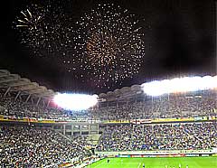 ワールドカップの感動をスタジアムと共有。各地で大型テレビによる観戦花盛り。日立市の日立駅前新都市広場には、200インチと180インチの2台の大型スクリーンが設けられ、「鈴木隆行を応援する会」の呼びかけに集まった約1500人の市民が声援を送りまいした。 FW鈴木隆行の母校、日立市立大沼小の体育館では、鈴木がかつて在籍した大沼少年サッカースポーツ少年団の児童約60人や恩師など約300人が5メートル四方の大スクリーンに声援を送りました。ボールがわたった鈴木が大写しになる度、オレンジのユニホーム姿の児童はうちわを振り回して声援を送っていました。 |
