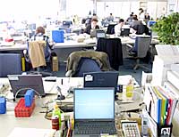![]() 三重県庁舎内を視察 北川県知事の号令の下、三重県ではドラスティックな行政改革・県庁改革が行われていました。 今年4月からいわゆる部課係などの一般的な仕切は廃止され、部局長の下に、次長・課長級からなる施策担当の「総括マネージャー」、さらにその下に課長・課長補佐級からなる基本事務事業担当の「マネージャー」が置かれました。総括マネージャーやマネージャーに決定権をおろし、部局長らは広い視野で知事をサポートする「知事官房」としての役割を果たしています。 こうした人事政策の他、仕事場の様子も大きく変わりました。まず個人用の椅子と机が廃止されました。その時の仕事によって、大きな机の好きな場所に座ります。書類はキャスターがついたサイドテーブル(引き出し)に入れます。職員一人一人にパソコンとPHSが配備され、いつでもどこでも効率的に仕事ができるような体制になっています。 |